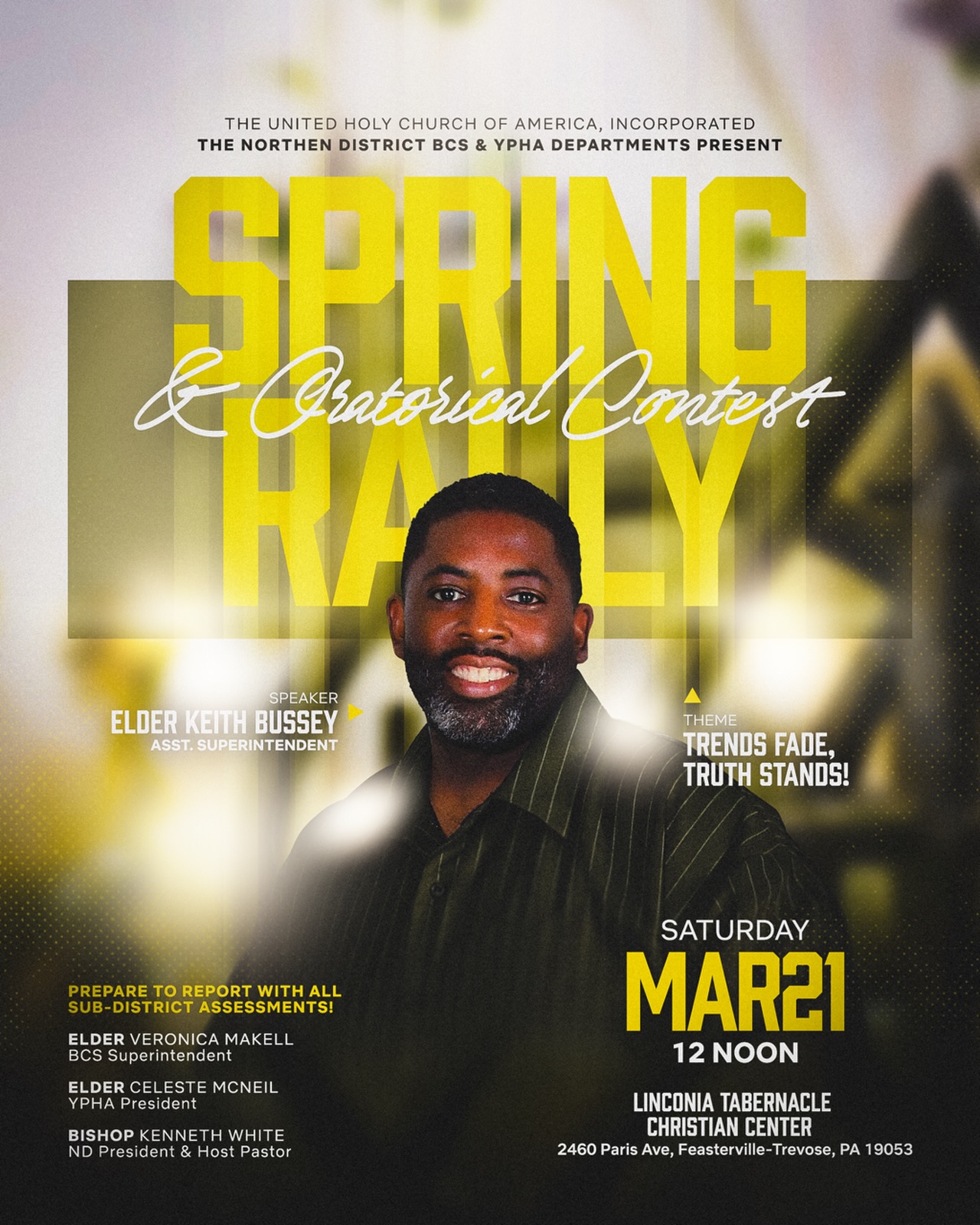 The Northern District BCS and YPHA Departments of The United Holy Church of America invite you to attend the Spring Rally & Oratorical Contest. This special gathering will bring together youth, leaders, and members from across the district for a time of inspiration, fellowship, and spiritual encouragement.